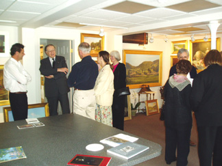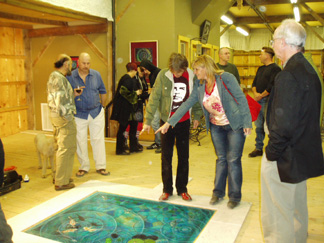 Yanusz Gilewicz, (center L.) pointing to one of his paintings.