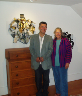 as the owner is moving out of the area. I got to Andes Antiques and Art at Blink where Merna Popper has created a combination Gallery and Antiques Store on Lower Main Street. Merna is showing 19th & 20th century Posters and in the upstairs gallery Gary Hayes has his sculpture. I call it sculpture but it could be book art, mixed media, or? Gary didn’t have a category for it. Gary has taken various sized art books and, leaving the bindings intact, cut up the pages and folded them, etc. The contents explode out like a very crowded pop-up card and one gets a gestalt of the book: Brancusi, The Italian Countryside, Russia: 1900-1917, Marilyn, Van Cleef and Arpels. His work will be up until the end of October. The gallery was packed, people coming, going, drinking champagne and buying art. There were so many different things to look at and the downstairs space allowed for intimate arrangements as well as large cases