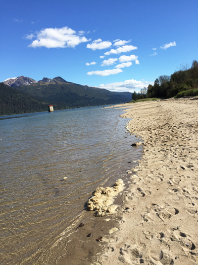 Mendenhall Glacier, 13.6 miles long, is one of many glaciers of the Juneau Icefield, and one of the most visited glaciers in Alaska. As I was sitting on the silt from the glacier it seemed like a lot of beaches I’ve been on and found some beautiful stones that I brought home. I could have sat there all day listening to Nugget Falls, enjoying the mist— so refreshing, cool and sprinkling. I heard many different languages as people took pictures and enjoyed sunbathing. A very long ice float goes by, must be the length of a football field….