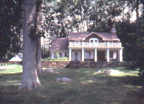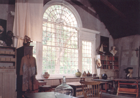 Born in Massachusetts, NC came to the area as a young art student. It was love at first sight. With the proceeds of his 1911 sale for Treasure Island, he bought 18 acres of hillside and woodlands, scarcely a mile from the museum that now houses his paintings. There he built a house and a studio. There he and his wife Carolyn raised five artistically gifted children. After his death in 1945 his widow lived on in the house and after her death in 1973, their daughter Carolyn, continued living in the house and painting in the studio until she died in 1994. The Brandywine River Museum was designed for public access. The family homestead was not. But in 1996 arrangements were made whereby museum visitors could visit both the house and the studio in small, escorted groups. Because cars are not permitted at the homestead, museum visitors are transported by shuttle van and escorted first through the ground floor of the house and then through the studio. In the so-called Big Room, its immediately apparent that this is the hub of family life. Light pours in through uncurtained windows. Its a country room, a happy room, filled with family photographs, well-thumbed books, paintings, a piano and a bust of Beethoven, an apt reminder that daughter Ann was a composer as well as an artist. Life in the Wyeth household was never dull. No father was ever more involved or devoted to his children than NC. Andrew, reminiscing about his father, delighted to recall the rituals of Christmas. Long after Santa Claus had been defrocked, NC would clamber across the roof on Christmas Eve, stomping in heavy boots, jingling sleigh bells and calling his Ho Ho Hos down the chimney. Charades and skits were family specialties. As soon as a child could hold a crayon, he or she was given workspace and encouraged to draw "whatever you see around you." Household pets included not just dogs and cats but rabbits, ducks, ponies and birds, both domestic and wild. In the Wyeth household, self-expression was always valued above school on the theory that the children could learn as much in their fathers studio as they could in a classroom. The studio with a huge north-facing window has been returned to its 1945 appearance, the year that NC and a grandson were tragically killed on a nearby railroad crossing. Propped on an easel is an unfinished portrait of George Washington as a young surveyor. It was the artists final work, its completion halted by his death. Everywhere in the spacious room are the artists props...a birchbark canoe, a sword, seashells, old glass bottles, capes and plumed hats, a plaster cast of Lincolns death mask. Theres a staircase on rollers, which the artist used when working on murals and other oversize pieces.