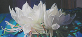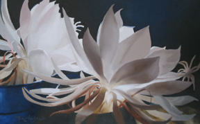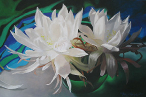 EVERY SO OFTEN we are treated to an artist’s vision that can well nigh overpower us with its haunting beauty — a particular case in point, Franz Heigemeir’s “Night Blossoms” currently on view at the Woodstock Artists Association.* “Night Blossoms”, Heigemeir’s “celebration of a rare event” — specifically the blooming of a cactus (epiphyllum oxypetalum, “Queen of the Night”) that he and his wife have nurtured over the years — is comprised of fourteen paintings ranging in size from a modest 18”x24” to a diptych some nine feet wide by three feet high. As the exhibit’s title indicates, the paintings are floral depictions of a plant that only blooms at night (indicated by the simple black background that fills most of the paintings), its delicate blossoms an astonishingly joyous challenge of light to the night’s all-encompassing darkness. What Heigemeir has captured in his paintings is the power of these delicate blooms to not only generate their own glow, but also to mysteriously imbue the surrounding night with a luminosity that — for want of a better word — can only be called ‘magical’. Rendered larger than life — the sheer dimensions of the larger paintings dramatically adding to their already overwhelmingly exquisite presence.