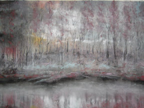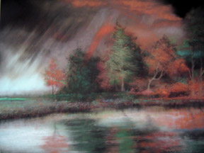 THIRTY PAINTINGS — twenty-eight pastels and two oils — comprise this “tribute” to the Catskill Region, an exhibit* that celebrates the ongoing love affair with the area’s landscape that began with such early “Hudson River Painters” as Cole, Church, Kensett, Gifford, and Inness — to name but a handful — and which has been carried on to the present day by the latest crop of landscape painters. It’s customary to measure contemporary painters with those of the past — to suggest that this or that painter follows in the footsteps of this or that forerunner, if only in the spirit of complimentary praise — but the truth is that if there is indeed a “Hudson River School” of landscape painters, the only thing that connects them — and this is indeed a significant connection — is the unparalleled beauty of the natural surroundings that characterize the Hudson River/Catskill Mountain Region. Each painter — from Cole to the very latest tyro setting up an easel along field, rock ledge, stream, overgrown copse, dense thicket, or leveled field — interprets what is seen through an individual sensibility. There is a far cry from the aesthetic vision behind Church’s vistas to Gifford’s contained scenes, from Cole’s moral-laden fantasyscapes to Cropsey’s homey genre scenes. After all, such a diverse offering that the eastern part of New York State has to offer deserves no less than a believable disparity of responses. All artists worth their salt, then, have seen the riches of the region through their own eyes and predispositions — and Milbourn is no exception. Himself a painter of fine observational skills, Milbourn combines an accomplished grasp of draftsmanship with a sensitive eye for the beauty inherent in both detail and scope. He sees — and captures — the exquisite complexity of the struggle for existence between untended wildflowers (“Burst of Color”) as well as the breath-catching grandeur of dramatic skies (“Sky Falling” — and he finds the beauty of such natural phenomena in all seasons (“Spring Jungle”, “Autumn Haze”, “Winter Dust”). Especially arresting is Milbourn’s ability to convincingly bring up from his ground the fine detail of individual stalk, branch, or leaf — not an easy task when confining oneself to the medium of pastel. Close-up does not faze him as is so evident in “The Stone Wall”, “Tall Grass”, “The Dead Tree” or “The Green Tree”, for