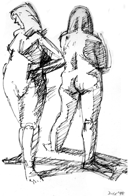 Standing Nudes, Back to Back" Pen and Ink by Lois Dodd |