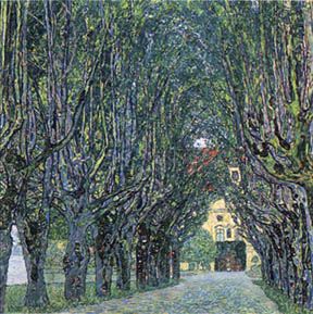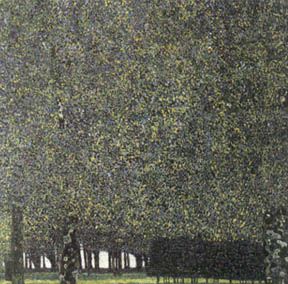 It is my sense that part of what I call Klimt's "heaviness" is due to his style the very style which has made his portraits so uniquely his and, one must add, so eagerly sought. Klimt loves the lushness of detail, the full brush in service of the plethora of images that he manages to cram into a painting. The very density of his landscapes is further enhanced by his use of a heavy impasto, a prodigality of pigment that rises up from the canvas to ensnare the eye. If elegantly striking in, say, the adornment of a female subject, his unchecked delight in detail seems to so crowd a landscape that one feels suffocated in its very beauty. No air seems able to permeate a Klimt field of flowers, a leaf-laden tree, or a grove of towering pines. There is, in fact, rarely a horizon that includes a sky in a Klimt landscape - no room for anything other than nature's overflowing cornucopia of plenty.