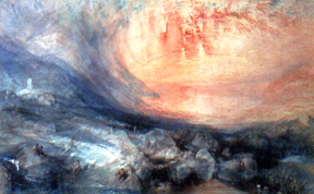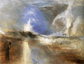 As Ruskin suggests, Turner is not "about" things not "about" the sea, or ships, or whales but "about" light and energy and the unseen forces of nature. A Turner sea is not a simple depiction of undulating water, but an attempt at presenting a palpable sense an "impression" if you will of what the moving sea feels, sounds, tastes even smells like. Turner sees the ocean as only an island-bound native who lives in its midst, as it were, sees it. He does not so much romanticize it as he does to force it on our consciousness. He rubs our noses in it showing that it is an entity that brooks no interference from humankind. It may suffer us to ride upon its surface, but it will allow for no lasting footprint and gives no quarter to the faint or weak-hearted. Wild, implacable, uncivilized, rapacious, dangerous and eternal, it tempts, betrays, and devours the reckless and theunsuspecting. Beautiful at one moment, it can turn in an instant into a raging, brutish, and faceless monster. With brush and pigment, Turner is less concerned with giving us a painting of the sea that might please us, as he wants to give us a sense of a sea that, at bottom, is an equal opportunity destroyer.