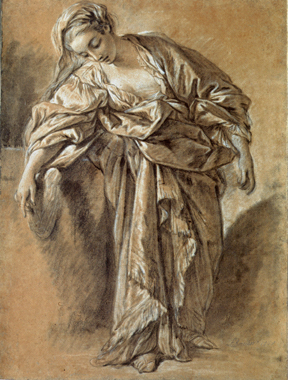 Though he can handle almost any subject his landscapes (e.g. "Landscape with an Undershot Mill and Outbuildings" C.1755-58 (Black Chalk), "Landscape with a Mill-Pond, Mill, Bridge, Washerwoman, and Boy" c.1750s (Black and White and Colored Chalks, over Graphite, on Blue Paper can readily compete with the finest of Dutch masters and handily proves that he might well have made his mark in this genre alone Boucher seems most at home (and almost always his most delicate) when he is depicting the female form. Whether lusciously nude (as in his oft reproduced "Recumbent Female Nude" ca.1742-43 (Red, White and Black Chalks on Cream Antique Laid Paper), or meticulously attired as his "A Young Shepherdess Seated on the Ground, Holding a Heart Target by a Ribbon" 1753 (Black Chalk w/Some Stumping, Red Chalk, White Heightening, Touches of Blue and Pink Pastel and Gray Wash, on Fawn Paper), he seems eminently at home in the presence of women whether in the homely atmosphere of the kitchen, the out-of-doors, or in the boudoir. He is adept at catching them at the most intimate of moments and quite effortlessly seems to capture the slightest details (e.g. note the bunched-up dress at the rear of the seated woman in "Study of a Young Woman Seated in a Chair Holding a Rod" c.1734-35 (Red Chalk counterproof, Strengthened by the Artist Himself w/Red Chalk); the rigid stance of "A Lady Being Dressed by Her Maid" ca.1742-45 (Pen w/Brown Ink and Bister Wash, over indications of Black Chalk; the graceful curve in the back of "The Young Garden Girl" ca.1760-64 (Pen and Brown Ink, Brown Wash over Red Chalk); or the nape of the girls neck (a view, that to this viewer, always seems to convey a charge of erotic frissonnement) in "Head of a Young Woman with Hair Tied up, Seen from Behind" ca.1740-41 (Red, Black and White Chalks on Fawn Paper). This is figurative art at its very finest. As meticulous as he was in depicting women, Boucher was equally at home in capturing the soft roundness of children (see the many sheets of cherubim and putti) or the angular musculature of men ("Double Académie (Study of Two Male Nudes, On Suppliant" ca.1735-40 (Red Chalk); "Académie (Nude Study) of a Man as a River God" 1740s (Red Chalk); "Study of the Figure of Apollo" ca.1753 (Black Chalk and White Heightening, some Stumping, on Greenish-Gray Laid Paper). Nor was he inept when laying in architectural background, as many of the drawings prove. Startling, at least to this viewer, was "Study of Figures on the March" c.1765 (Black and White Chalks on Mid-Brown Paper) which in its dramatic perspective and truncated figures seemed strikingly modern in its conception (as if foreshadowing the influence that Japanese graphic works and the advent of photography would have on 19th Century French painters). Drama, incidentally, is much in evidence in many of Bouchers drawings, several seeming much like studies for elaborate stage settings of history plays. Rarely is there a static line in these richly detailed (yet rarely overstated) portrayals of bodies in passionate movement or distorted position, each individual form carefully rendered and placed for maximum clarity and effect. In all, François Boucher could surely be counted among the finest draftsmen that the golden-age of French academic drawing produced. For the working artist as well as any aficionado of the art of drawing this is a show that you will not want to miss. And, again, The Frick Collection is to be commended for keeping alive a much-needed appreciation for the oft-maligned art of good, solid draftsmanship. *"The Drawings of François Boucher" (thru Dec 14): The Frick Collection, 1 East 70th St., NYC (212) 288-0700. After closing at The Frick Collection, the exhibit will travel to the Kimbell Art Museum in Fort Worth, Texas (the only other U.S. venue) and be on view from January 17 through April 18, 2004. An accompanying catalogue of the same title with essays by Alastair Laing and Pierre Rosenberg, former director of the Musée du Louvre, is available: 264 pp.; 8 x 10 1/2; Over 100 Color Illus.; Notes; Checklist; Literature Cited; Exhibitions Cited; Index. American Federation of Arts/Scala Publ. Ltd. $55.00 Hardcover ($37.50 Softcover). (Photos for this Review: Courtesy The Frick Collection) |