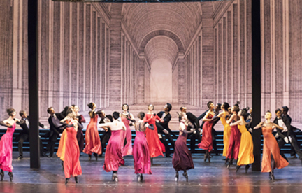 The ballroom scene, with the women dressed in long, slinky dresses in shades of burgundy, red and orange, many backless, and the men in black formal attire (except for Cinderella in a soft, white, body skimming dress and the tieless Prince in white) could have been a scene out of The Great Gatsby. The choreography included long lines of shifting, tilting dancers and showed some of Ratmansky’s best relationship to the music, although the punks running in and out were distracting and did not add the touch of modernity they were probably intended to do.