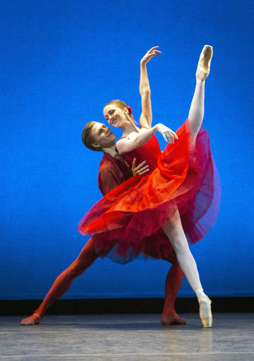The Pas de deux from The Flower Festival in Genzano, perhaps Bournonville’s best-known work, exhibited his traditional grace, interconnecting phrasing and the strong role he accorded his male dancers. Ulrik Birkkjaer showed the ballon, the effortless beats of the beautifully pointed feet encased in the Danish male ballet slipper, with its black bottom and white v-shaped top, and the spinning turns that have made these men so sought after.