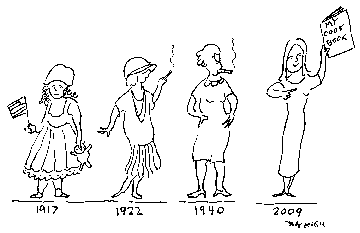 HENRY P. RALEIGH The turn of the last century defined for the movies the earliest, first developmental stage of the good American woman. This was the primitive level of the all-American girl tightly packaged before the post-war importing of foreign actresses could introduce their immoral ways. At this point, they didn’t smoke, not having biologically adapted to what was then viewed as a behavioral trait of jaded, depraved sophistication. The good movie woman, like Blanche Sweet, Mary Pickford, Linda Arvidson and Fanny Ward represented the most natural girl/woman ideal: pre-adolescent, wholesome, plucky, lots of get-up-and-go, generally without bosoms, and none too bright, bordering on the ditzy and moronic. The films of Chaplain and Keaton take advantage of this genetic defect. But there was a dark side hidden in the movie female’s DNA that would be revealed by Fox Studio in an important mutational leap. This took the form of Theda Bara, nee Theodosia Goodman, a nice, unknowing girl from Cincinnati. Bara became the Vamp, a seductress who sexually lured men to their doom. While Bara’s career was brief, 1915 to 1918, this trace of lusty female danger was too good to be abandoned. Was it not Zeus, who in creating Pandora, called her a ‘beautiful disaster’? Whether vamp or virgin, the ladies of that period were remarkably small, and if you wished to be mean about it, most were slightly on the dumpy side as well as bosomy challenged — biologically speaking. Even Greta Garbo, in her Swedish film days, was plump. Geraldine Farrar, a popular actress from 1915 to 1920, was fleshy from top to bottom. The American Girl look to put it plainly, was short and sturdy. The waywardness of the evolutionary drive would make another jump ahead in the ‘20s. Given now that the majority of post-war movie-goers were women, awakening perhaps to their own genetic impulses, Hollywood went all out to please them with a steady dose of romantic love stories and, forcing natural selection a tad, a new cast of taller and slimmed-down actresses. For Pola Negri, Norma Talmadge, Garbo and Gloria Swanson, the studios created male stars as romantic complement — Rudolph Valentino, Ronald Coleman, John Gilbert. The women of these emotionally-charged love dramas bore, if not the appearance, still most of the homey virtues of the older stars — innocence, purity, and fully clothed. Opposing them were the actresses who inherited the suspect vamp gene and who became the iconic representation of the Jazz Age, a startling mutation that was destined to last. Colen Moore in the 1923 “Flaming Youth” was the first of the flapper girls, Clara Bow tagged as the IT girl of the era. Louise Brooks and Laura la Plante popularized the flapper’s signature short hair and bangs. The flappers brought in a different kind of woman — a dash of eroticism, aggressive, no longer the simple country girl, but urbanized and while their movies were silent you knew they were smart and sassy. Most of them now smoked and drank and they would set the scene for the actresses that would evolve out of the ‘30s Great Depression. The American studio system was in full swing by the ‘30s, a marvel of efficiency and control, a biological wonder in itself, each studio holding a roster of contract stars, bringing in the best script and dialogue writers in the business who could artfully side-step the censorship restrictions on the 1930 Production Code. Out of this emerged the new and improved American woman — Rosalind Russell, Myrna Loy, Carol Lombard, Ann Sheridan (the Oomph girl), Claudette Colbert, Katherine Hepburn — these paired off with male counterparts — Gable, Tracey, Grant. Here were the women to be reckoned with, no swooning, timid, virginal girls but grown-up, fast-talking, wise-cracking, emancipated and tough. The dramatic features were shored up by Bette Davis’ cigarette puffing, excitable mannerisms and Joan Crawford’s amorous sufferings. The studios wrote scripts for their individual personae, provided them with clever lines. The 1940s opened on another war and women’s evolution paused, slid back a bit as actresses found their roles patriotically shifting to war brides, the-girl-back-home, swell girls doing their best in factories and USOs. Colbert goes to war in “So Proudly We Hail” and “Since You Went Away”; Loy, patient mother and wife in “Best Years of Our Lives”. Hepburn largely ignored the changeover continuing in grand style with “Woman of the Year” and “Adam’s Rib”. But the ‘30s gang would never be the same again. Most of the emancipated movie ladies would go on into the ‘50s but were up against some evolutionary shifts. Post-war prosperity converted the former, ‘she-who-waits’ woman to ‘she-who-is-a-happy-homemaker’. Television sit-coms pumped out a stock woman character, the aproned mother/housekeeper in shows like “Ozzie and Harriet”, “Leave It to Beaver”, and “Father Knows Best”. Some of this would seep into film threatening to halt the evolutionary march of movie women if it was not for a fortuitous mutation that proved the Darwinian observation that at certain moments a physical trait, long suppressed, might suddenly appear. Jayne Mansfield, Marilyn Monroe, Rita Hayworth, and Jane Russell bowed in as the ‘50s sex symbols. Some, like Hayworth, served as the voluptuous girl from-across-the-tracks, Monroe the dumb blonde, Mansfield even dumber, Russell, referred to as the primal female, was not shy at sneeringly parodying the sexual movie persona. All were exceedingly well built. In a classic genetic merger, an adaptation of opposite behavioral traits in a single genus that would bring joy to any student of Darwin, Hollywood engineered a Doris Day — pert and perky, forever chaste yet hinting at sexual promise. Everyone’s dream girl, Day’s innocent sex comedies were enormously popular in the ‘50s and ‘60s — and safe. Her movie genes would pass o