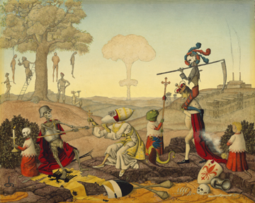 Hangmen, cockerels and cats share space with Roman soldiers, bishops and saints. Jokes are juxtaposed with powerful statements. In the "Death And The Bishop" the figure in the foreground, the Bishop, hugs a young naked boy while in the background Death waits with a wooden stake. The message, Colini says, " is enjoy now, pay later. This is how they die, by the stake." In a painting entitled "The Martyrdom of Unidentified Saint" the large, glowing goose in the foreground is Colinis first wife. The smaller image of the martyr carrying the cross is the artist, himself and the message? Colini shrugs and laughs. Colini, who paints on Masonite topped by gesso, peoples his art with familiars including himself, his cats and his hometown. Elements of his peripatetic life, his childhood, his beliefs (he is a Buddhist) and his omnipresent sense of humor are everywhere. Sly, humorous, downright funny and simultaneously breathtaking, his paintings are truly "ars fantastica." Colini has painted for more than 60 years. He is well known in Europe and his paintings have been exhibited around the world but Colini knows how limited the exposure is, how few people will ever see the originals. So when this Renaissance man stumbled on giclée, it seemed like a perfect answer. A highly skilled photographer and a former FORTRAN programmer, Colini is no stranger to technology. He wanted to use this emerging process to capture, preserve and reproduce some of his works of art some of which have never been seen by the public. "More people could see my art. More people could afford it and there would be more glory for Colin," says the towns namesake. "The city would be seen all over the world." Colinis first try at giclée was disappointing as was his second. Then Lizza Fine Art Studios opened its doors in Tunkhannock, Pennsylvania in the fall of 2003. The renovated roller rink is home to the first and only Cruse CS285 ST in the United States, the most technologically advanced, large format, high-resolution scanner in the world.